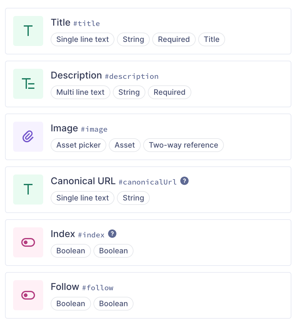 As you can see, it’s a simple yet highly effective component that we incorporate into our content models. We retrieve the SEO data alongside the page data to build an SEO-compliant page. You’re welcome to use this as a foundation for your projects. Naturally, the frontend implementation will vary depending on your chosen library or framework.