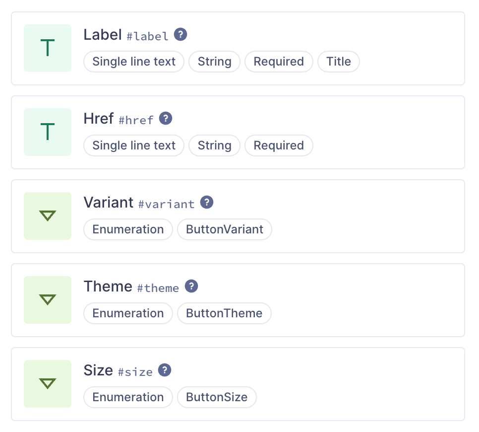 Notice how “variant”, “theme” and “size” fields are enumerations, to pick a value consistently from a predefined set. We can then reuse these components in other components by nesting or in models as fields.